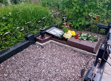 Так выглядит окончательный вариант места захоронения. В правую верхнюю часть надгробья мы установили заранее изготовленный элемент, на территорию участка досыпали каменную крошку, цветник наполнили мульчей.